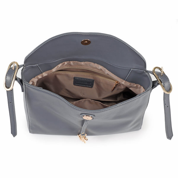 • La piccola pattina con chiusura magnetica nasconde un unico e comodo spazio con due tasche laterali, una porta cellulare e una con chiusura a zip.